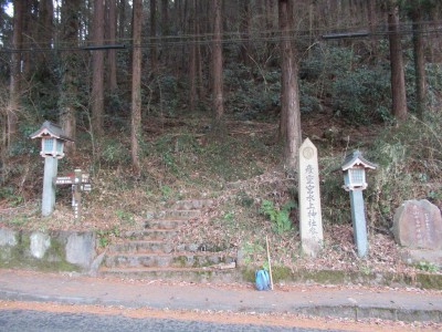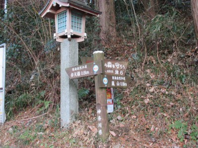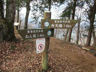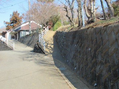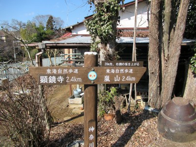 そこから竹林の中を通り過ぎると右手に住宅が見えてくる。大房山の住宅だが居住は不明 住宅入り口を左に進む大房山はなだらかであり、少し進むと右側から広い道路が現れる、嵐山橋から大房山に登ってくる道路だ。そこに東海自然歩道の標識があり鼠坂まで1.2kmとなっている。